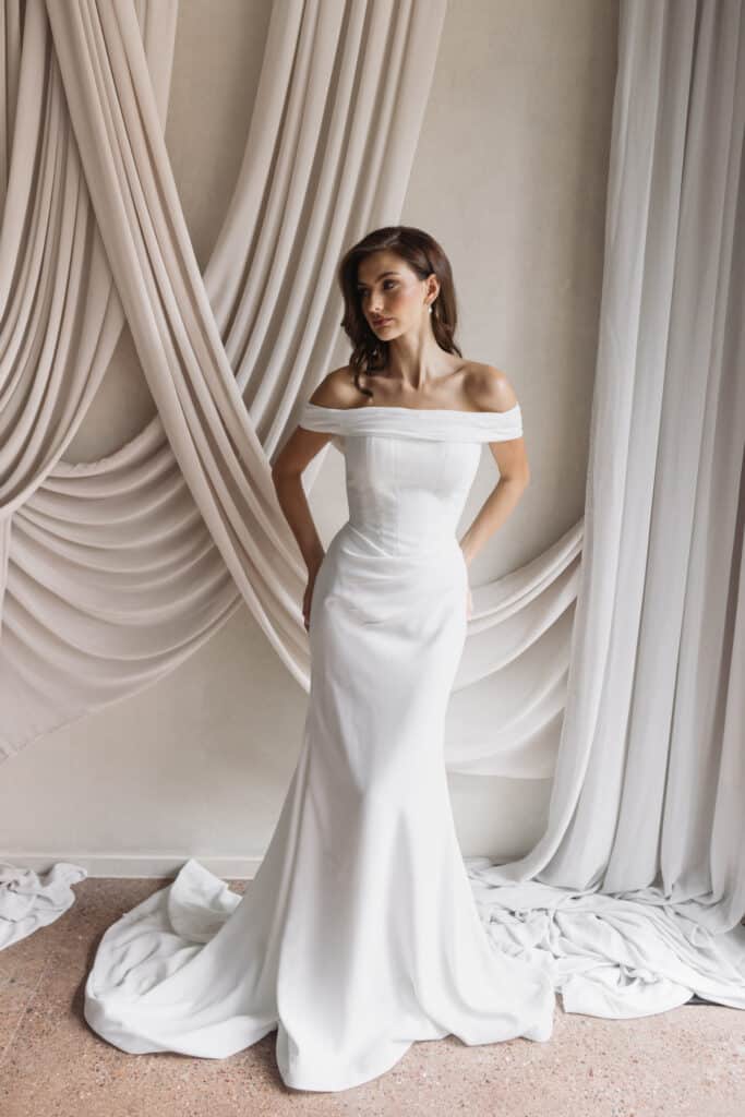 Celine is the definition of sleek, sculpted, and effortlessly versatile. Crafted from luxurious french crepe, its fitted silhouette is designed to flatter with a basque waist and soft skirt ruching. The detachable pleated off-the-shoulder band transitions the dress from ceremony to a strapless reception look. For added drama, you can style Celine with the detachable oversized bow train. Celine is finished with a softly curved back that sits low while still offering ultimate support