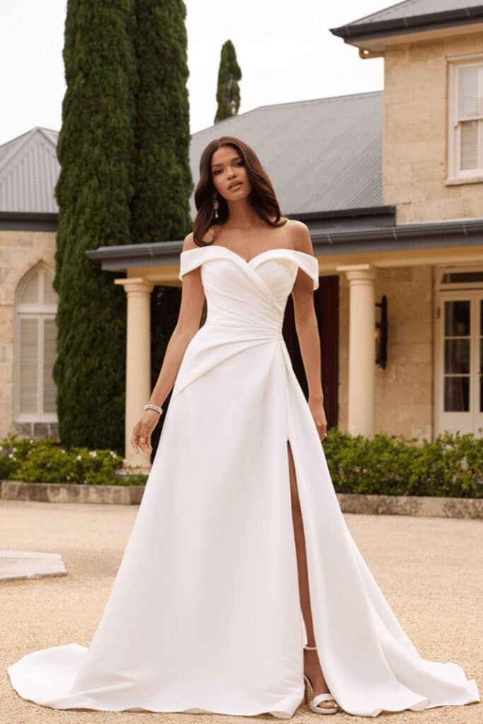 Meet Chandra, the epitome of bridal perfection! This exquisite gown is crafted from luxurious pearl mikado, offering a stunning silhouette that exceeds all expectations. Chandra's sweetheart bodice is adorned with delicate draping and elegant off-shoulder straps, ensuring a universally flattering fit. The grand ball gown skirt exudes sophistication, elevated by a sultry slit that adds just the right amount of drama to your minimalist bridal ensemble. Completing the look are fabric-covered buttons cascading down the entire chapel-length train, adding a touch of timeless elegance to Chandra's impeccable design.