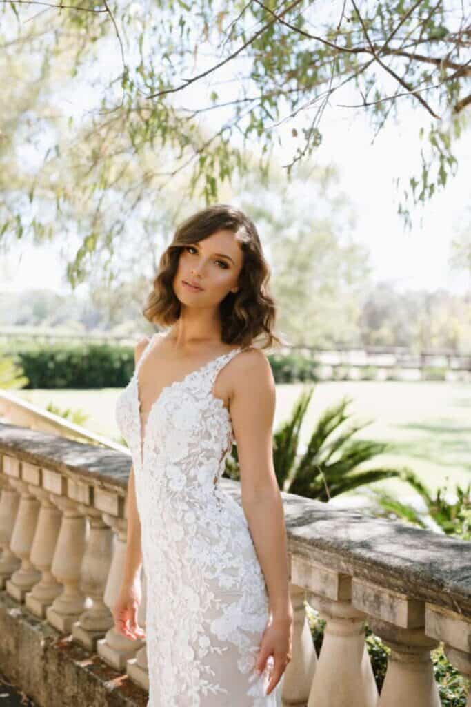 All your bridal dreams come to life in this boho-inspired wedding dress that strikes the perfect balance between classic and contemporary. Crafted from soft tulle and stretch lining for ultimate comfort on your dream day, Finley features floral-inspired cotton lace that dances along the edge of the plunging V-neckline and onto the delicate illusion straps. The contrasting lining makes the lace appliqués pop as they cascade down the classically cut fit and flare skirt. The sexy sheer back zips up beneath fabric covered buttons, leading to a romantic train with floating lace details and a laser-cut edge.