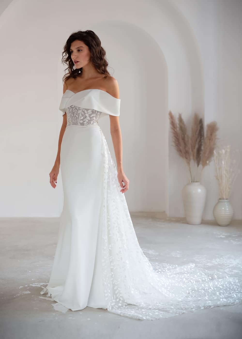 Dare to dream in this sexy, fashion-forward Imogen gown. Crafted from white crepe sculpted in a soft trumpet silhouette, Imogen is the head turner you’ve always desired. A sheer, embroidered center with corset boning sets this modern wedding dress apart. It’s also styled with a feminine and flirty, twisted off-the-shoulder collar and breathtaking detachable skirt that decorates the back of the gown in with bohemian-inspired satin-stitch leaves.