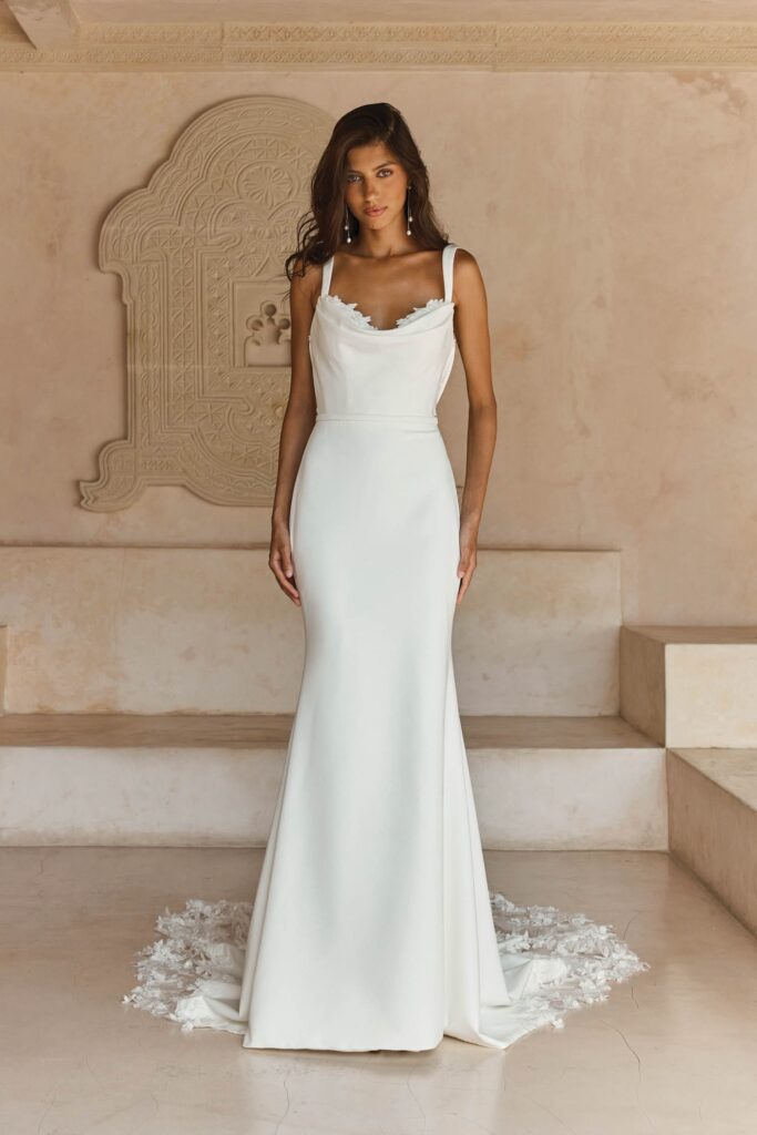 Simple and elegant, yet beautifully modern is our Lanette wedding dress in ivory crepe designed for our classic effortless Madi bride. With fabric draping right on-trend, we love her cowl front neckline featuring the most perfectly flattering drape detail and a touch of embroidered sequin 3D motifs peeking out of the bust to give a hint of sexy softness.