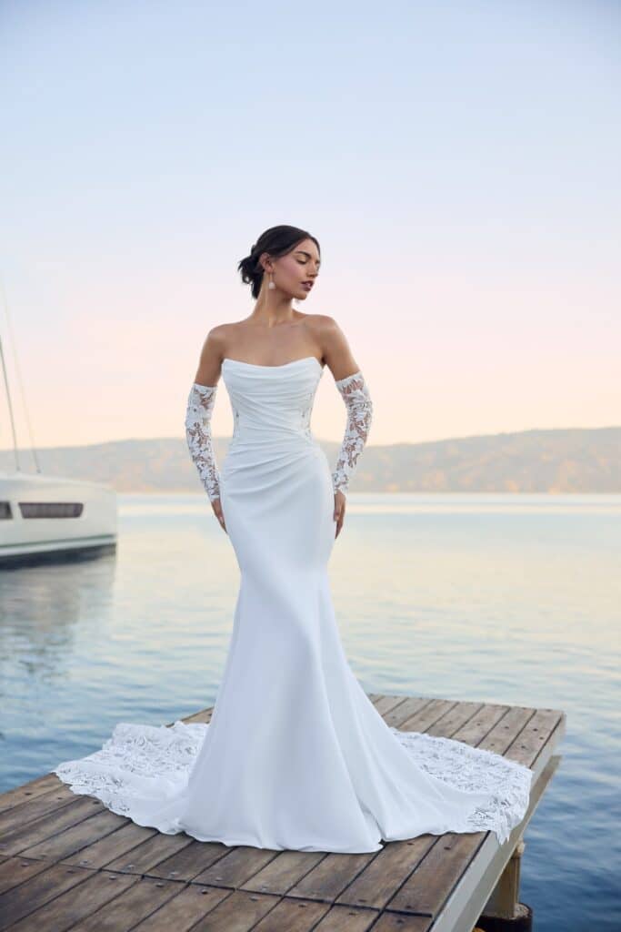 Looking for a dreamy, lightweight, crepe bridal gown with floral lace details? Lucie is just what you've been searching for! Her bodice features carefully curated draping that effortlessly draws the eye to the waist for the most flattering of looks. Her modern, soft scoop neckline and off-shoulder, long sleeves combine to create a sense of romance.