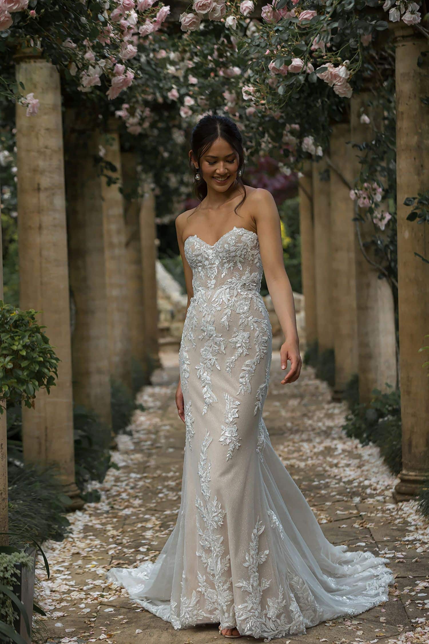 Provence is a stunning blend of elegance and sophistication. The strapless sweetheart neckline is adorned with botanical lace, sequins, and beads. The illusion bodice flows into a fitted skirt, accented with embroidered lace and center-back buttons. The dramatic illusion train, lined with soft jersey, ensures comfort. For a versatile look, Provence transforms from a ceremony gown to a reception dress with detachable glitter tulle puff sleeves, featuring lace cuffs and buttons.