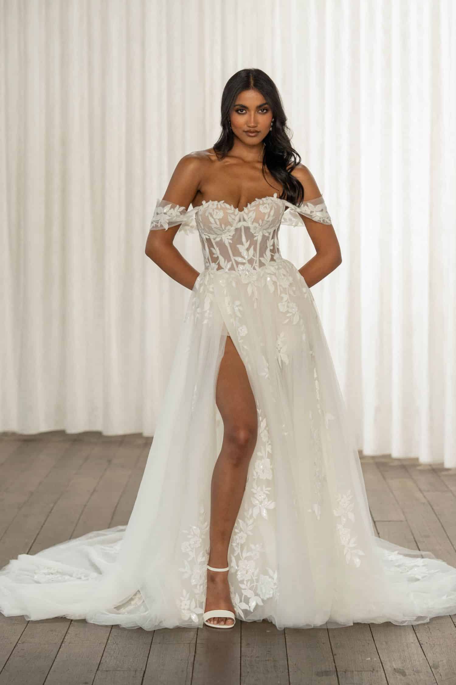 Our Twyla wedding gown is Madi Lane, personified. As part of our new Ceres collection, Twyla is the epitome of a modern princess look. Her full lace A-line shaped gown has a light and ethereal quality with delicate botanical-inspired lace detail, flower motifs and a touch of sequin sparkle. Her sweetheart neckline frames the illusion bodice,supported by exquisite exposed boning, and laced at the back for a secure fit .