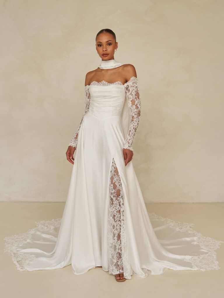 Effortlessly chic and endlessly romantic, the Ward wedding gown melds sleek minimalism with couture-inspired detail. Its slinky satin skirt drapes fluidly, parting at a thigh-high slit to reveal an unexpected whisper of traditional Chantilly lace. A modern square, off-the-shoulder neckline flows into a softly draped bodice edged with delicate lace trim. A refined Basque waistline cinches the silhouette, while a coordinating satin neck scarf lends a final touch of contemporary elegance.