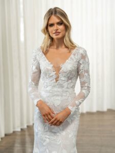 Demure and delicate, Tahlia is a beautiful wedding dress for a bride who likes the look and coverage of long sleeves. Bold contemporary floral motifs dusted in sparkle are placed atop a layer of delicate Chantilly under-lace adds dimension and contrast.
