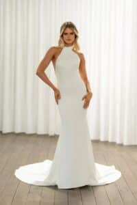 Tris is simply elegant, designed in light crepe for a fashion forward bride who prefers a minimalist look. Her perfectly pleated high neckline cuff is a unique modern halter neck feature which creates a smooth shapely elongated effect through the body, balanced out by her soft fit n flare skirt.