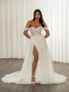 Ultra feminine and sexy is our Thane wedding gown. Gorgeous vine-inspired lace sits atop Chantilly lace with a slightly plunged sweetheart neckline and boned construction through her well-sculptured illusion bodice. Her modern Basque-inspired waistline brings a fresh aesthetic, and included are detachable fitted long lace sleeves.