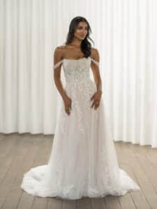 Our Twyla wedding gown is Madi Lane, personified. As part of our new Ceres collection, Twyla is the epitome of a modern princess look. Her full lace A-line shaped gown has a light and ethereal quality with delicate botanical-inspired lace detail, flower motifs and a touch of sequin sparkle.